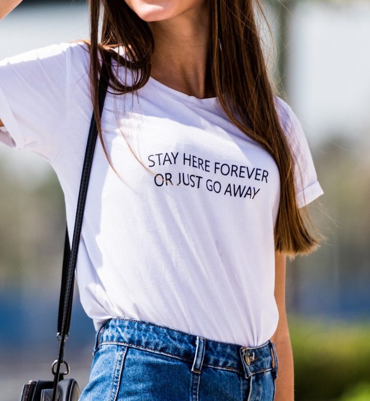 Находишь симпатичный топ, идеальной длины и с красивым вырезом, а на самом видном месте красуется надпись вроде «Живи. Смейся. Люби». Мне вот интересно, кто все эти люди, которые пишут на футболках всякую ерунду? Даже в подростковом возрасте это вызывало отвращение.