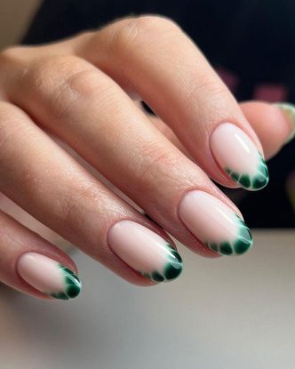 Любительницам минимализма понравится идея абстрактного френча поверх прозрачной базы. Выглядит такое покрытие необычно благодаря технике «negative space» — нанесению нейл-арта поверх прозрачного лака. Для дизайна вы можете выбрать любые оттенки зеленого: от нежного цвета матчи до насыщенного изумрудного с эффектом металлик. Вы также можете сделать френч объемным — такой эффект получится благодаря использованию гель-лака.