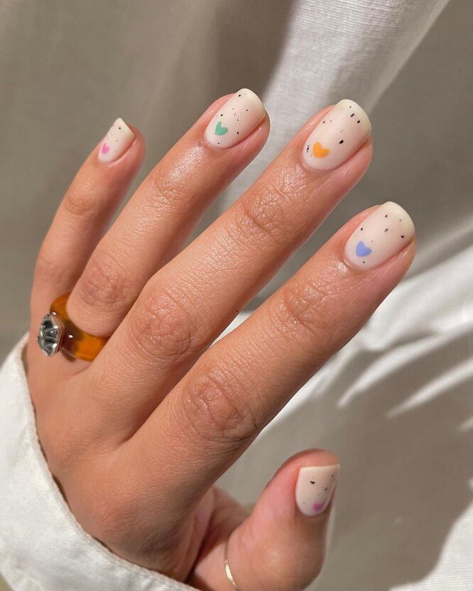 А этот матовый дизайн будет особенно трогательно смотреться на ногтях небольшой длины. Небрежные крапинки и незамысловатые сердечки составят отличную пару, а молочная основа станет для них лучшим холстом.