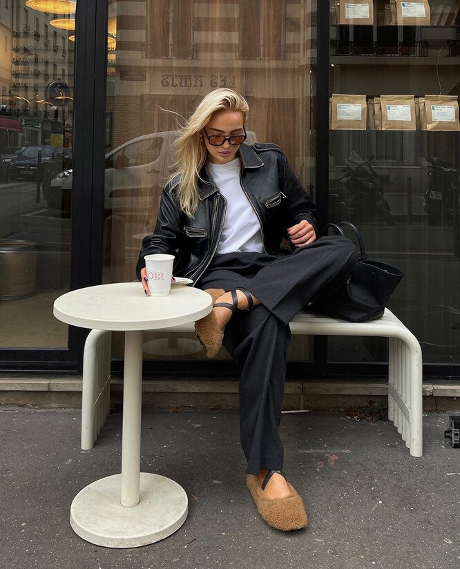 Лонгслив с костюмными брюками — базовая комбинация, которую можно носить как в офис, так и на прогулки с друзьями. Всё зависит от стилизации, поэтому вариант «на каждый день» мы предлагаем дополнить косухой. Кожаная куртка такая же неотъемлемая часть весеннего гардероба, как и однотонные лонгсливы. Тут же можно надеть балетки, кроссовки или грубые ботинки — зависит от того, куда ты собираешься пойти в таком аутфите.