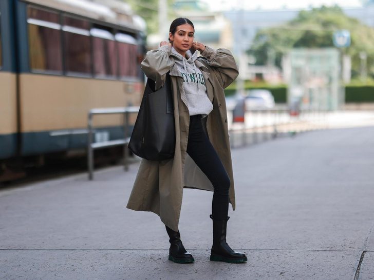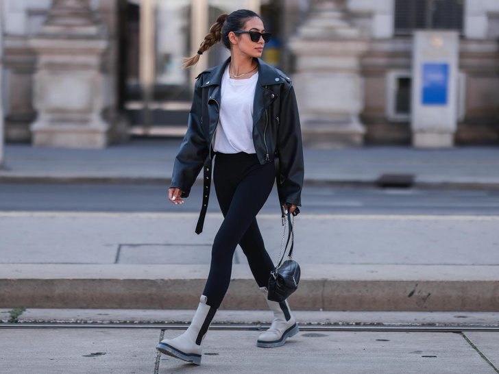 Стильно выглядеть можно и в полностью однотонном образе, если его основу составляют черные скинни джинсы и черная кожанка. К последней, правда, в мире моды предъявляются определенные требования: она не должна иметь броских деталей по типу крупных серебряных ремешков, молний и цветастых узоров. В таком случае есть риск выглядеть вызывающе. То есть более уместно будет остановиться на оверсайз бомбере или дубленке из кожи, а не на байкерской косухе. Не стоит забывать про обувь: ее следует подбирать под ситуацию. Например, для похода в магазин или встречи с подругами подойдут спортивные кроссовки или удобные балетки, а для делового мероприятия — лаконичные туфли на небольшом каблуке.