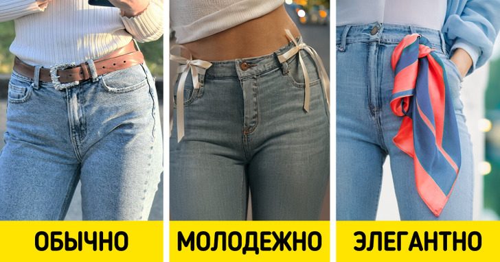 Ремень — базовый аксессуар, которым можно и скорректировать посадку джинсов, и дополнить образ. Но если хочется прокачать свой стиль, то вместо обычного ремня можно использовать ленты. Их можно продеть в боковые или задние шлевки и завязать кокетливый бантик. Допустимо экспериментировать и с шириной лент, и с материалом, и с цветом — каждый раз будет получаться новый и необычный образ.