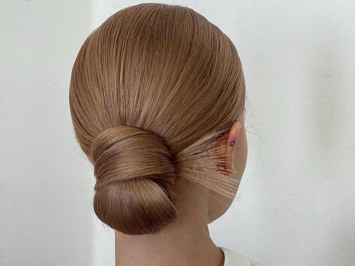 Элегантный и очень женственный вариант пучка подойдет в качестве вечерней укладки. Повторить прическу легче, чем кажется. Сначала соберите волосы в низкий гладкий хвост и зафиксируйте тонкой резинкой. Затем сделайте из волос петельку так, чтобы кончик хвоста остался свободным. Оберните его вокруг резинки и зафиксируйте невидимками.