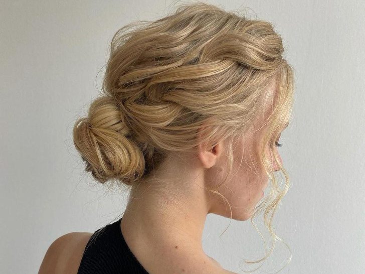 Очень нежный вариант прически с пучком, которая дополнит романтичный образ для свидания или посиделок с подругами. А более сложные плетения подойдут и в качестве укладки на выпускной или свадьбу. Не бойтесь экспериментировать с пучком. Например, чтобы сделать образ более расслабленным, можно выпустить и слегка завить передние пряди.