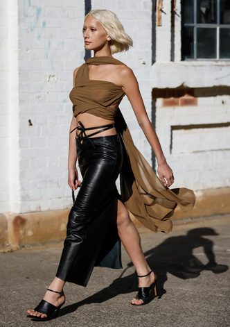 Юбка макси из эко-кожи будет гармонично смотреться с каблуками и рубашкой или жакетом оверсайз. Такую же юбку можно пристроить и в осенне-зимний гардероб. Утепляем образ с помощью колготок, высоких сапог и свитера.