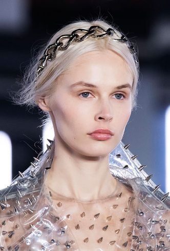 Настоящий фурор произвели цепочки из страз и переливающихся камней с показа, вплетенные в волосы — выглядит свежо, а сама укладка не займет много времени. Никто не запрещал нам провернуть тот же фокус с цепями — например, закрепить их у основания хвоста. Похожий вариант мы заприметили на показе Balmain: здесь Оливье Рустен использует массивные цепи вместо ободка, создавая более брутальный вариант диадемы.