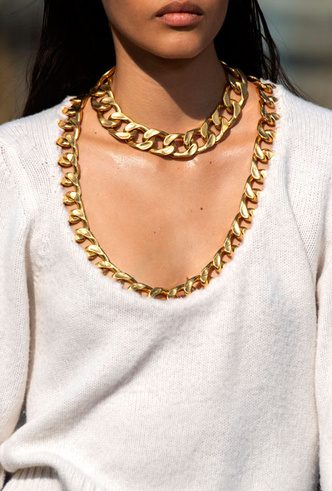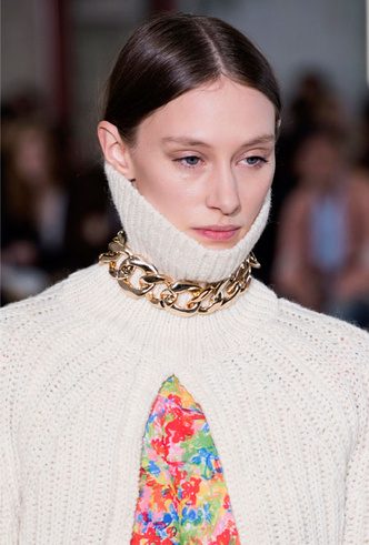 Мастхэв наступающего сезона — гипертрофированно огромные ожерелья-цепи, как на показе JW Anderson. Причем чем крупнее и больше звенья, тем лучше. Самый стильный вариант стилизации — поверх водолазки или свитера крупной вязки с высоким воротником — так, чтобы цепь была в центре внимания. Ориентиры можно найти в фотоотчетах Adeam, Aalto и Jean Paul Gaultier.