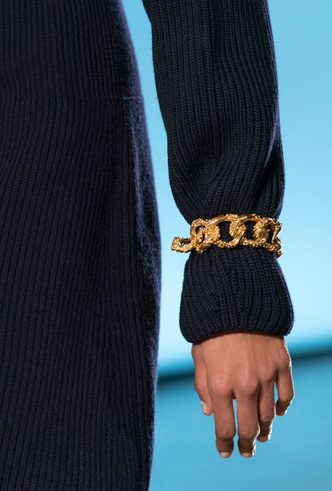 Из крупных и массивных звеньев дизайнеры представляют и браслеты. Такие можно смело надевать поверх свитера или блузы с длинными рукавами — прятать цепи не стоит. Как вдохновение — показ Gabriele Colangelo, где дизайнер надел крупный браслет на трикотажное платье.