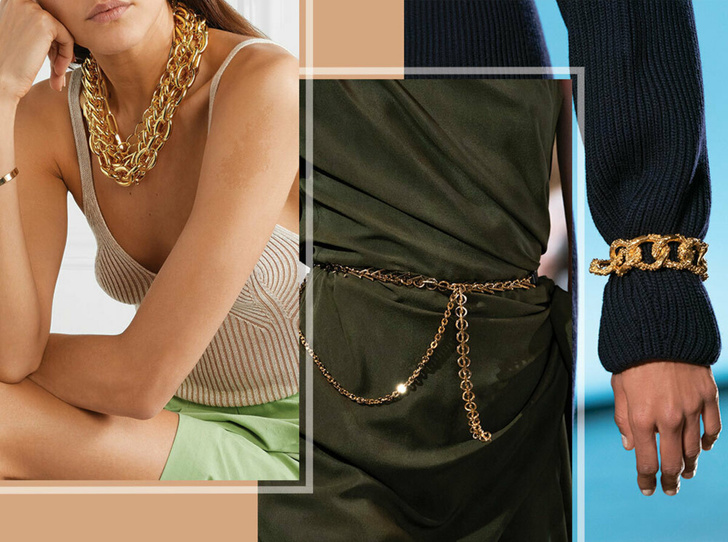 Самый интересный тренд, который уже успели опробовать стритстайл-блогеры — несколько цепочек на талии вместо пояса. Вы можете продеть такой аксессуар в шлевки или небрежно повесить поверх джинсов, брюк или юбки, выбрать одну крупную цепь или носить несколько тонких. Неоспоримый плюс — такие цепочки отлично будут смотреться даже с базовыми джинсами и бланковой футболкой.