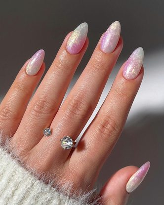 Переливающееся покрытие — альтернатива жемчужному или глазированному маникюру. Особенность нейл-арта не только в перламутровой основе, но и разводах, которые мастер создает поверх незастывшего лака. Повторить такой маникюр можно и дома: нанесите основной лак на ноготь, вооружитесь доттером или зубачисткой и нарисуйте узоры круговыми движениями.