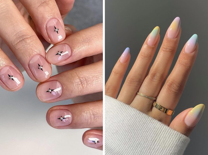 Попробуйте сделать «ауру» в пастельных и нюдовых оттенках, которые легко можно сочетать между собой. Не бойтесь разноцветных и непривычных комбинаций — благодаря пастельным тонам даже разнообразие красок не будет выглядеть вычурно.