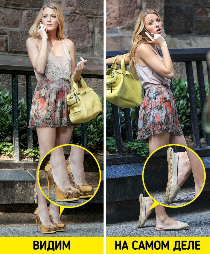 На съемочной площадке тоже существуют свои хитрости. Обычно актрисы надевают шпильки только в тех случаях, когда ноги непосредственно видны в кадре.