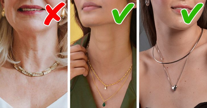 Длинные подвески — сувениры с курортов, жемчужные бусы и другие ожерелья, которые заканчиваются ниже груди, — не льстят образу, а порой выглядят нелепыми и устаревшими. Лучше выбирать более высокие блестящие украшения, но при этом избегать ожерелий из бусин, бисера и пластика. Отличный вариант — элегантные металлические цепочки. Чем ближе к лицу, тем свежее будет выглядеть кожа.