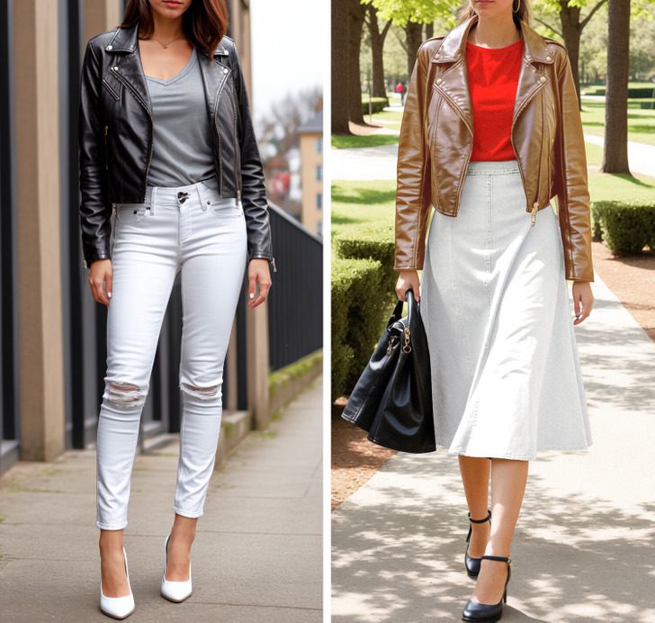Белые джинсы шикарно дополнит кожаная куртка или блейзер. Это идеальный вариант для прохладных деньков.