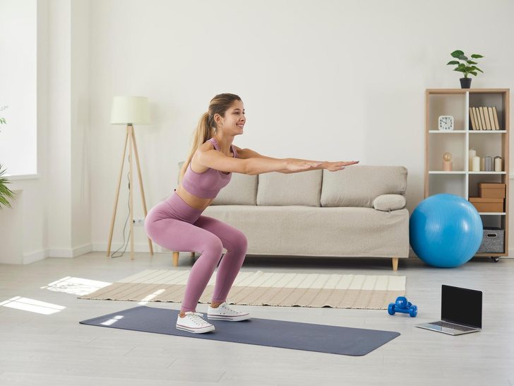 Встаньте прямо, ноги на ширине плеч, слегка согнуты в коленных суставах. На вдохе опускайтесь вниз, таз чуть выше колена, сохраняя естественный прогиб в пояснице, соберите руки перед собой в замок. На вдохе поднимайтесь вверх, толкая себя от пола, вес тела на пятках. Важно: сохраняйте правильную осанку, позвоночник в нейтральном положении, пресс напряжен. Сделайте 20 раз по 2 подхода.