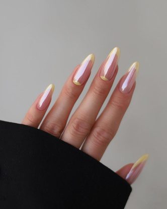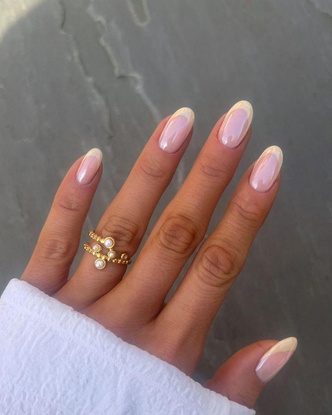 Этот дизайн объединил в себе сразу несколько главных нейл-трендов 2024 года. Сливочно-желтый оттенок, напоминающий масло, в сочетании с французским маникюром и глянцевым, хромированным финишем выглядит необычно и подойдет к каждому образу. Сливочный френч легко сочетать с другими оттенками и дизайнами.