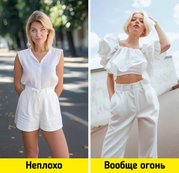 Стилисты рекомендуют вместо обтягивающие футболок (в которых вы наверняка вспотеете, даже если они из 100-процентного хлопка) и легинсов или джинсов скинни (которые визуально укорачивают ноги и делают фигуру более приземистой) присмотреться к более трендовым образам. Например, белый льняной жилет или укороченная просторная рубашка и широкие светлые брюки из легких тканей (выбирайте в полоску, они визуально удлиняют силуэт) и от жары защитят, и смотреться будут остромодно.