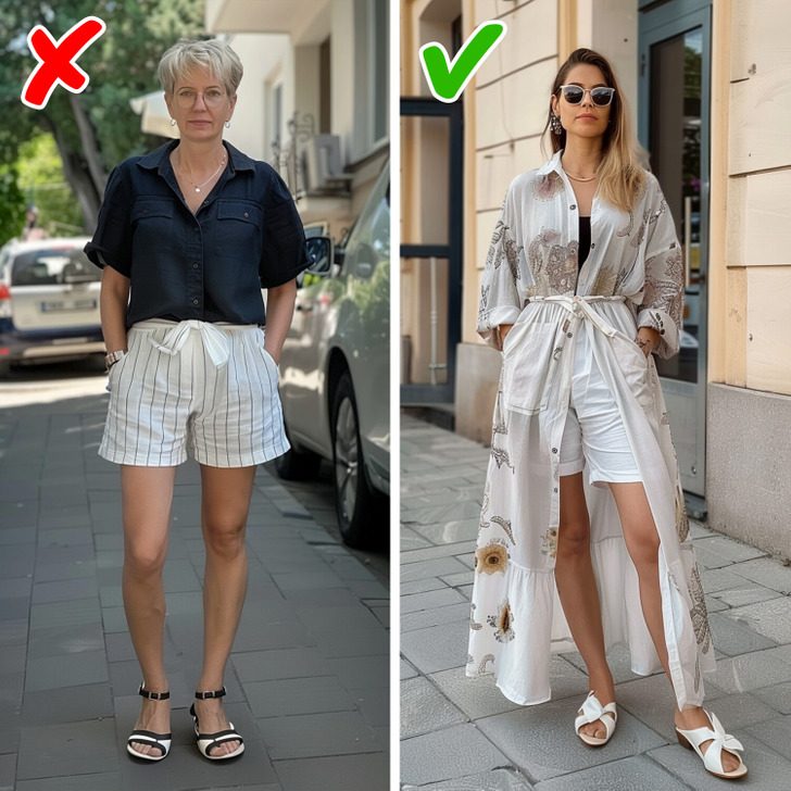 Эксперты советуют не совмещать в одном образе две короткие вещи — например, просторные шорты и такую же рубашку с просторными рукавами — это сделает фигуру визуально шире, да и выглядит скучновато. А вот легкое платье-рубашка нараспашку в сочетании с шортами и коротким топом отлично подойдет для того, чтобы не мучаться от жары и при этом выглядеть на все 100.