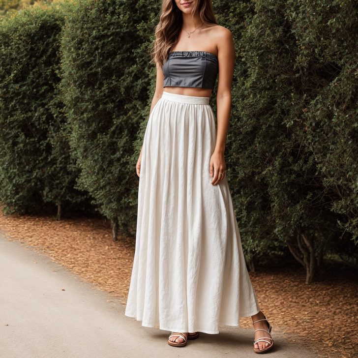 Широкие брюки прекрасно сочетаются с рубашками свободного кроя в тон. А что касается юбки, то присмотритесь к струящейся модели макси. Дополнить ее можно, например, топом без лямок.