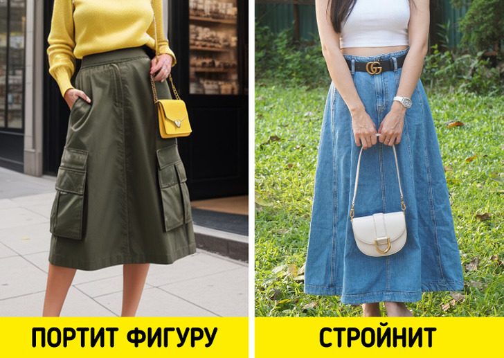 Юбки-карго — горячий тренд, но они подходят не всем, потому что делают бедра визуально объемнее. Вместо этого можно надеть длинную джинсовую юбку — такие модели стройнят. Ограничиваться только моделями макси необязательно. Модные эксперты предлагают экспериментировать с ее длиной.