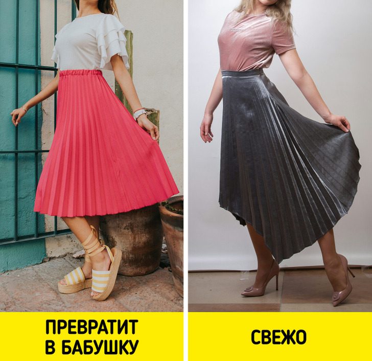 Еще недавно длинные плиссированные юбки казались приветом из прошлого, но модницы носят их снова. Если есть опасения, что такая юбка превратит вас в бабушку, можно выбирать модели с асимметричным, а не с прямым подолом.