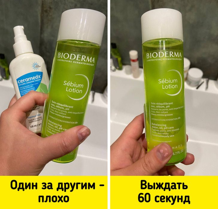 В надежде не опоздать на работу мы то и дело торопимся и наслаиваем продукты друг на друга, не давая им просохнуть. На самом деле это не совсем верная стратегия. Между применением тонера и крема лучше выдержать как минимум 60 секунд.