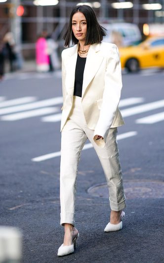 Брюки такой длины визуально увеличат рост и вытянут ноги. Стоит заметить, что время голых щиколоток давно прошло. Что касается защипов, они придают небольшой объем в области бедер, но, в отличие от предыдущего примера, смотрятся выигрышно из-за полной длины.