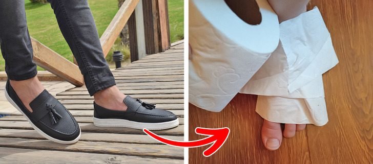 После прогулки в свободных туфлях пальцы ног порой просто отваливаются от боли, а на стопах появляются мозоли. Исправить ситуацию могут специальные стельки, но если их нет под рукой, то можно исправить ситуацию с помощью туалетной бумаги. Достаточно просто обмотать стопу бумагой (вместо нее можно использовать вату или носовой платок) так, чтобы стопа не болталась внутри обуви.