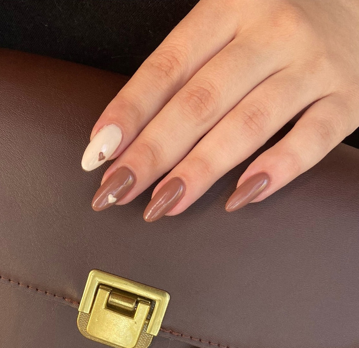 Одним из самых хитовых оттенков этого года стал коричневый и все его оттенки. Инфлюэнсеры даже прозвали такой маникюр «шоколадные ногти». Причем в зависимости от сезона можно выбрать тон светлее или темнее. Ну и конечно такой «дорогой» насыщенный цвет отлично подойдет для осени.