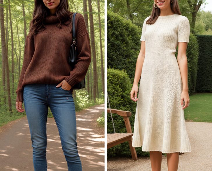 Для прохладной погоды подойдут не только привычные ветровки и жилеты-пуховики, но и элегантные вязаные вещи: уютные джемперы и кардиганы спокойных оттенков. Можно поискать необычные модели: например, джемпер с асимметричным вырезом. Также эксперты по стилю предлагают носить вязаные платья.