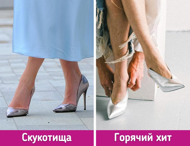 Блестящие и металлизированные оттенки сейчас в тренде. Если не хочется слишком выделяться, стоит присмотреться к лакированной обуви. Она выглядит роскошно, но при этом не вычурно. А вот матовый материал смотрится простенько.