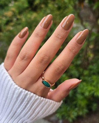 Отличная замена надоевшему нюду в бежевых и розовых тонах — маникюр в оттенке капучино. Он с легкостью впишется как в самые строгие офисные, так и в торжественные образы. Цвет выглядит уместно не только в однотонном исполнении, но и с декоративными элементами.