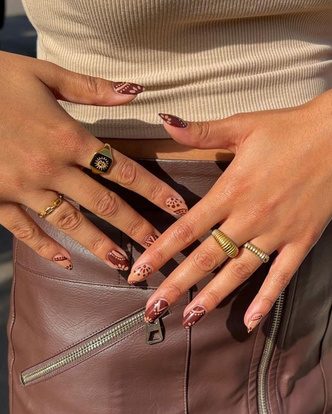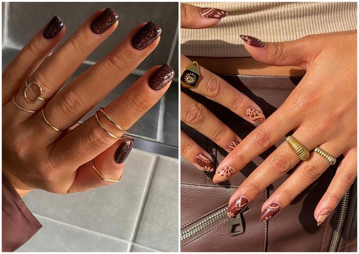 Для приготовления мокко эспрессо смешивают с растаявшим шоколадом и большой порцией вспененного молока. Маникюр в его стиле отличается более теплым и глубоким шоколадным оттенком. Такой вариант нейл-дизайна подойдет абсолютно для любой формы и длины ногтей.