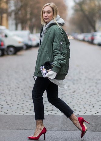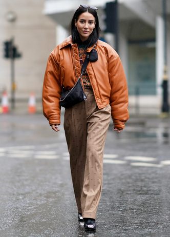 Лучшие дуэты с бомберами составят широкие джинсы с высокой посадкой, кожаные брюки и кроссовки или ботинки на тракторной подошве.
