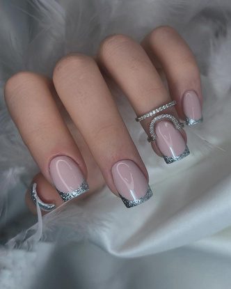 Блестящий маникюр выглядит интересно в самостоятельном исполнении, достаточно нанести перламутровый лак или сделать технику «кошачий глаз». Но добавлять на квадратные ногти толстую искрящуюся полосу — самый настоящий антитренд.