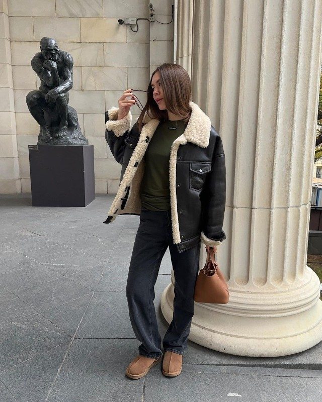 Дубленка в этом сезоне возвращается с обновленным силуэтом – выбирай укороченные модели с массивным воротником и подкладкой из овчины. Ее можно сочетать с базовыми вещами, как джинсы и свитер, а можно играть на контрасте, надевая с легкими шелковыми платьями и массивными ботинками. Добавь к образу кожаные перчатки и бейсболку – да-да, это сейчас ультрамодно.
