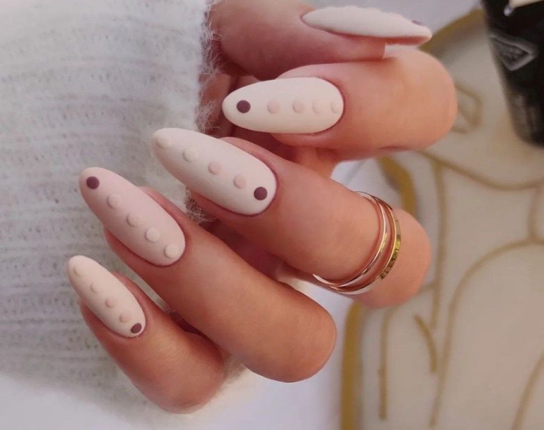 Базовый маникюр, подходящий абсолютно ко всему, – молочный матовый лак с объемным горохом по центру.