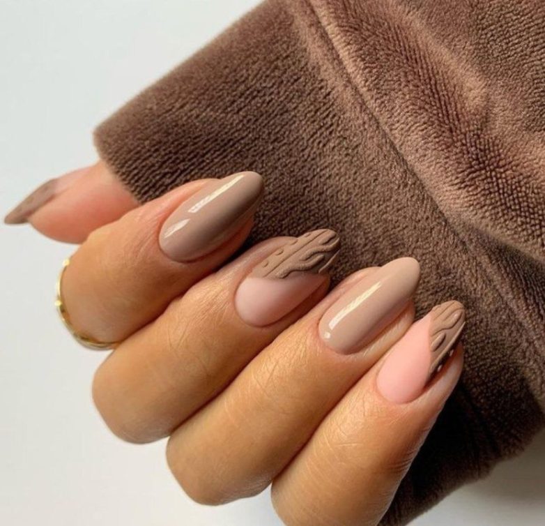 Вдохновляющая идея для сладкоежек – матовый маникюр, имитирующий плитку шоколада.