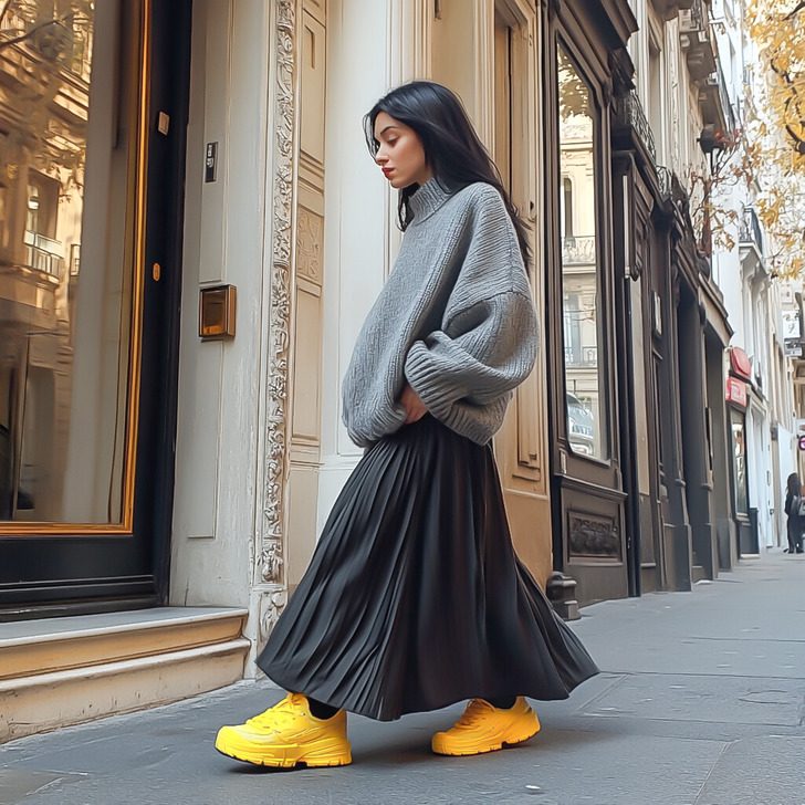 С помощью обуви можно кардинально поменять настроение монохромного образа. Например, простые белые кроссовки дополнят образ любого цвета: как нейтрального, так и более яркого. А вот цветные − могут стать главным акцентом приглушенного наряда. Например, черное платье в пол, серый свитер и ярко-желтые кроссовки. Получится одновременно стильно и элегантно.
