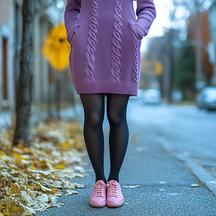 На смену летним платьям пришли теплые трикотажные платья-свитера. И они сочетаются с кроссовками не хуже летних моделей. Вы можете выбрать лаконичные однотонные кроссовки и сочетать их с платьем похожего оттенка. Например, фиолетовое платье и розовая обувь. Другой вариант, для более холодной погоды, замшевые кроссовки с меховой подкладкой. Такое решение стирает грань между повседневным стилем и элегантностью.
