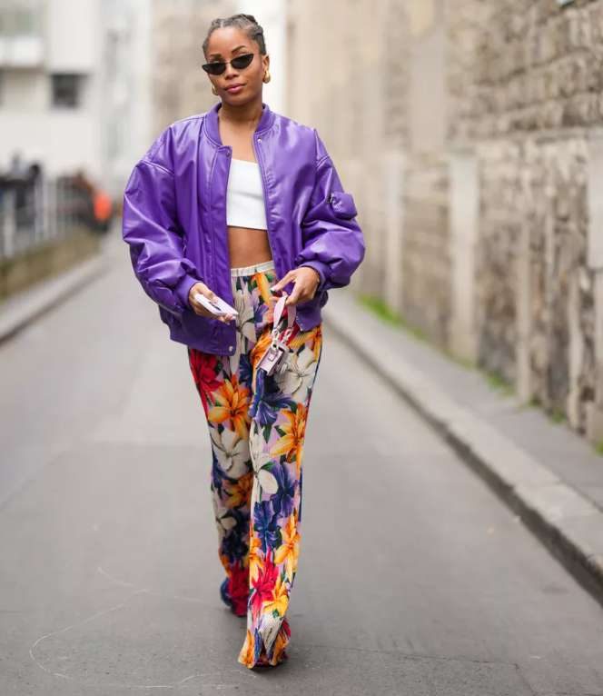 Все отметили громкость, с которой эти брюки кричат «Я люблю моду»? В то же время стоит признать, что все остальное в этом ансамбле должен быть немного более сдержанным, чтобы позволить им сиять. Именно здесь на помощь приходит бомбер темного оттенка. Мы рекомендуем выбрать однотонный вариант, который будет перекликаться с цветочными брюками, но не совпадать с ними. «Не любите флоральные принты? Возьмите широкую полоску или клетку для брюк. Или наденьте юбку в пол в том же стиле»,- предлагает стилист.