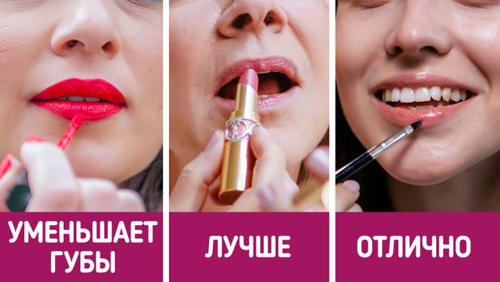 А вот матовая помада темных оттенков может сыграть дурную шутку. Во-первых, она визуально уменьшает объем губ. А во-вторых, такая помада порой попадает в небольшие морщинки вокруг рта и невольно привлекает к ним внимание. Если вы жить не можете без яркой помады, то стоит выбрать полупрозрачную легкую помаду, а поверх нанести блеск.