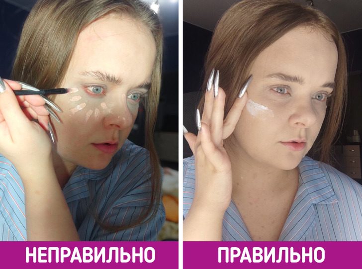 Если тональный крем надо как бы вбивать в кожу, то вот увлажняющие средства нужно наносить аккуратными круговыми движениями сверху вниз до полного впитывания. Кроме того, важно помнить, что больше — не значит лучше. Использование слишком большого количества продукта может привести к его скатыванию. А так теряется эффективность средства.