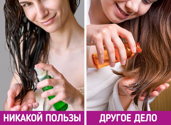 Чаще всего масло, как и многие другие несмываемые средства, наносят на влажные или даже мокрые волосы. Однако в случае именно с маслами это неправильно. Парикмахеры говорят, что так как вода и масла не смешиваются, влага просто не позволит полезным веществам из масла проникнуть в стержень волоса и просто остается на его поверхности.