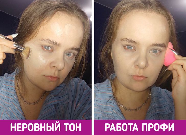 Независимо от того, пользуетесь ли вы кистью, спонжем или даже руками, не размазывайте тональный крем по лицу. Из-за такой техники тон ляжет неровно: пятнами или полосками. Вместо этого нужно прихлопывающими движениями как бы вбивать средство в кожу. Такая техника позволит нанести тональный крем равномерным тонким слоем без проплешин.