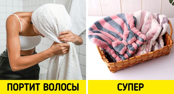 Чтобы уменьшить трение и лишнее воздействие на волосы, можно использовать не обычное махровое полотенце, которое может повредить их, а специальный тюрбан из микрофибры. Кроме того, что он быстрее сушит шевелюру, он легче, а значит, удобнее в использовании.