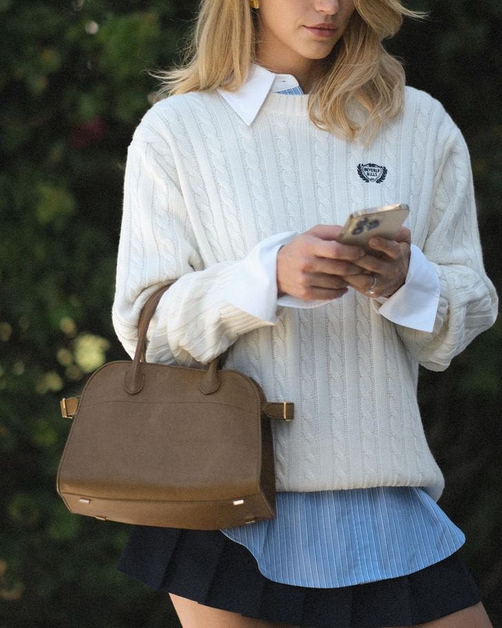 Здесь та же история, что и с ремнями. Логотип с большими блестящими буквами — это уже как бы дурной тон, такое слишком бросается в глаза. Небольшая лаконичная сумочка — то, что надо.