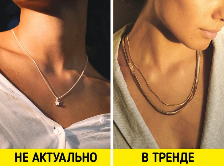 Нынешняя мода любит крупные украшения, поэтому тонкие цепочки не приветствуются. А вот цепи в несколько рядов и массивные подвески снова в топе.