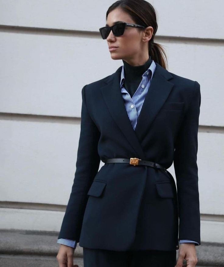 Жакет может быть свободным с мужского плеча. Чтобы акцентировать талию, повяжите кожаный шнурок или тонкий ремень поверх жакета. Также сделать акцент на талии поможет крупная брошь. Это сейчас очень модно.