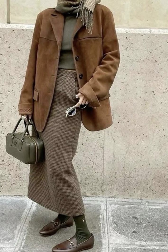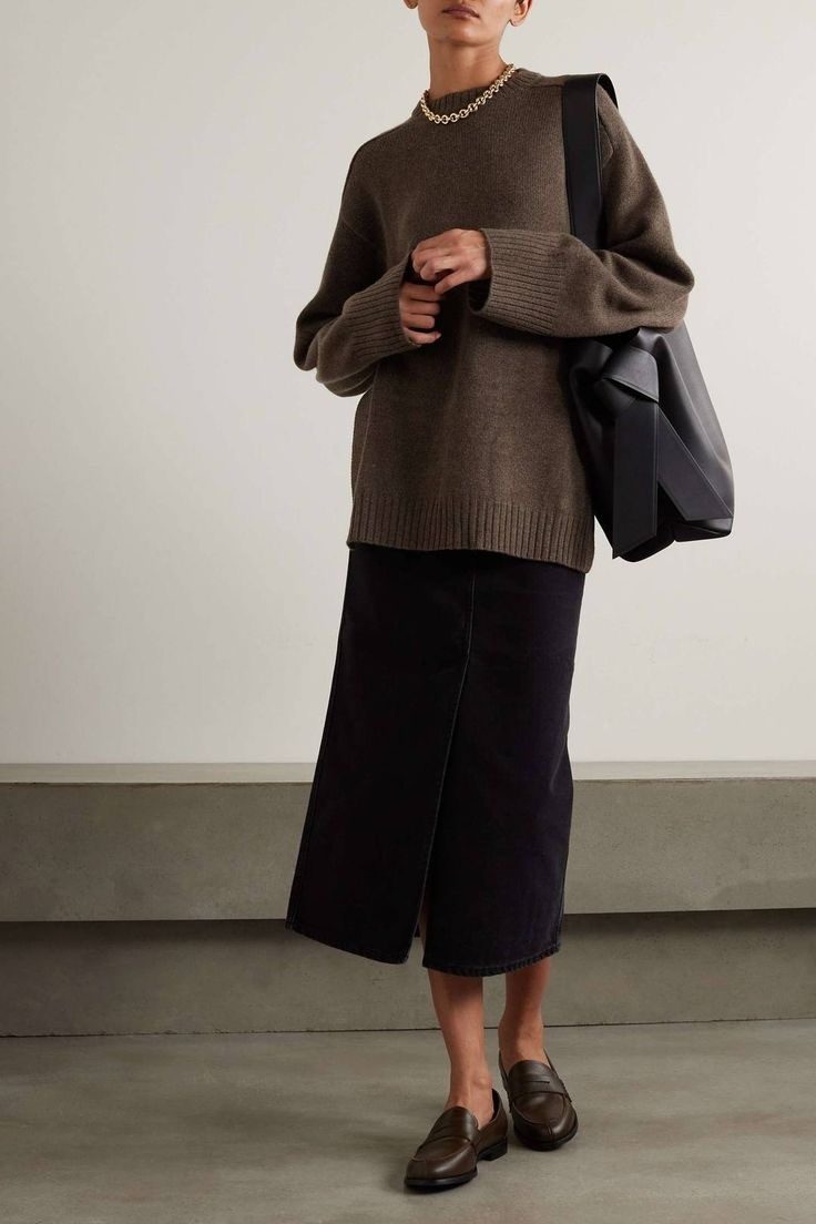 Что подчеркнуть фигуру и стильно выглядеть, носите тонкую водолазку с прямой длинной юбкой и лоферами. Сверху можно надеть замшевый жакет, удлиненный кардиган и теплую верхнюю одежду.